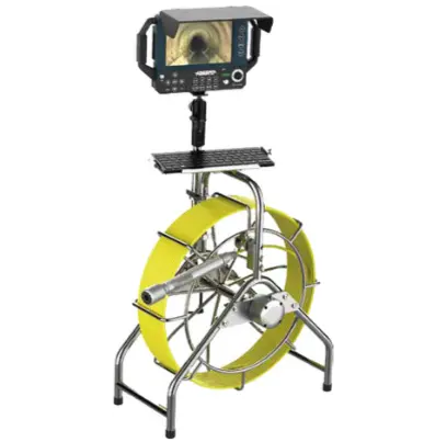 La caméra d’inspection VISIONEX dispose d’une tête rotative 360°/180° en HD 1080p et d’un câble de 60 m de long et 9 mm de diamètre, monté sur un dévidoir avec roues pour un transport facile.